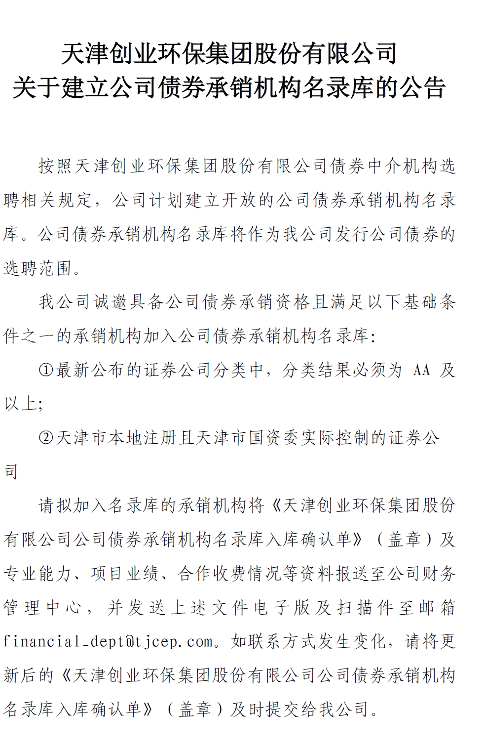 天津創(chuàng)業(yè)環(huán)保集團(tuán)股份有限公司關(guān)于建立公司債券承銷機(jī)構(gòu)名錄庫的...