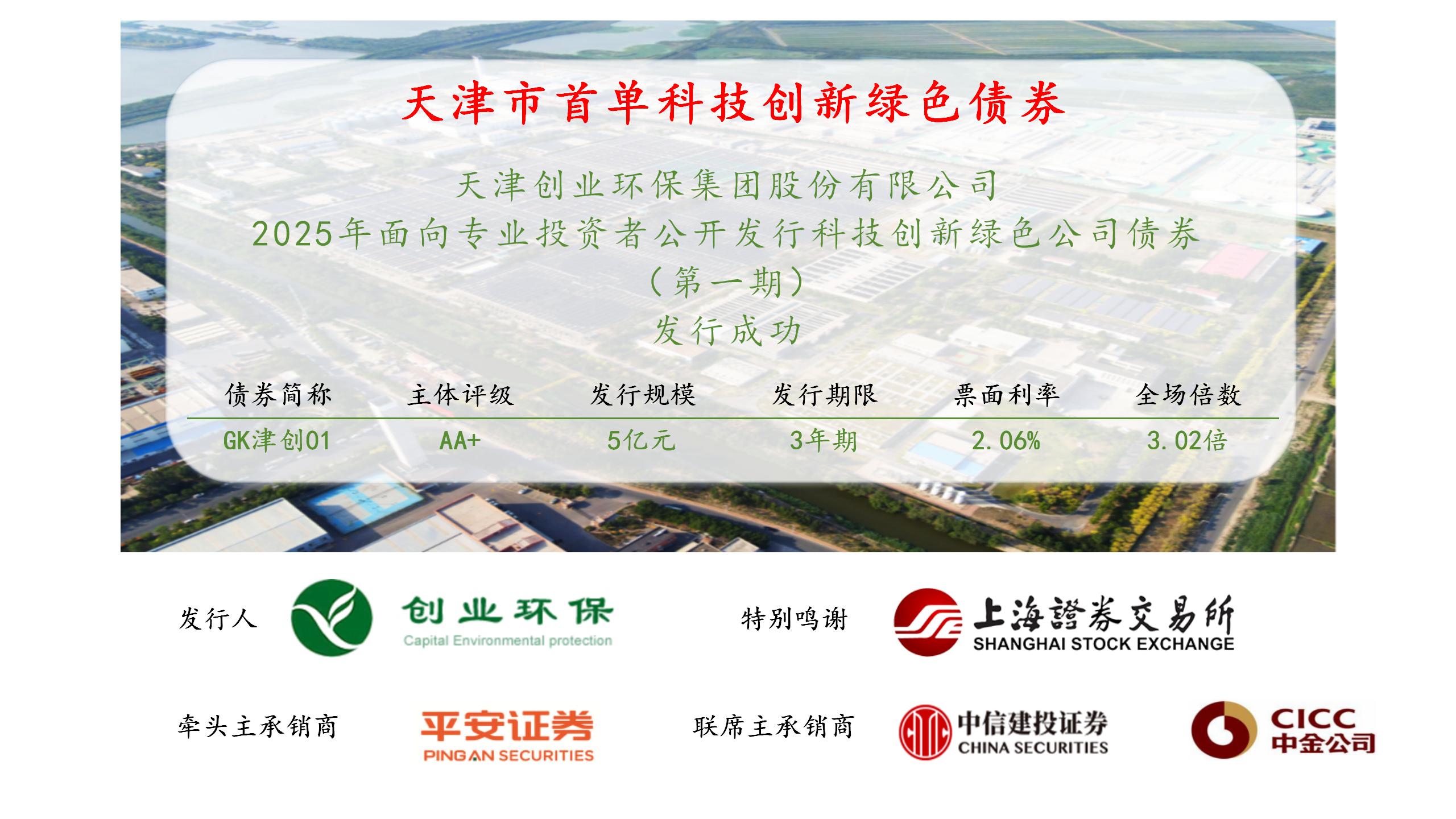 9月11日,在天津證監(jiān)局和城投集團的指導下,創(chuàng)業(yè)環(huán)保集團2025年面向?qū)I(yè)投資者公開發(fā)行科技創(chuàng)新綠色公司債券(第一期)在上海證券交易所成功簿記發(fā)行,是天津市首單“科技創(chuàng)新+綠色”債券,發(fā)行規(guī)模5億元,期限3年期,票面利率2.06%,全場認購倍數(shù)達3.02倍。這是創(chuàng)業(yè)環(huán)保集團對上合組織天津峰會關于深化綠色產(chǎn)業(yè)協(xié)同、強化科技合作共識的積極響應,以金融創(chuàng)新之為“主動出擊”,為區(qū)域可持續(xù)發(fā)展提供了扎實實踐樣本。